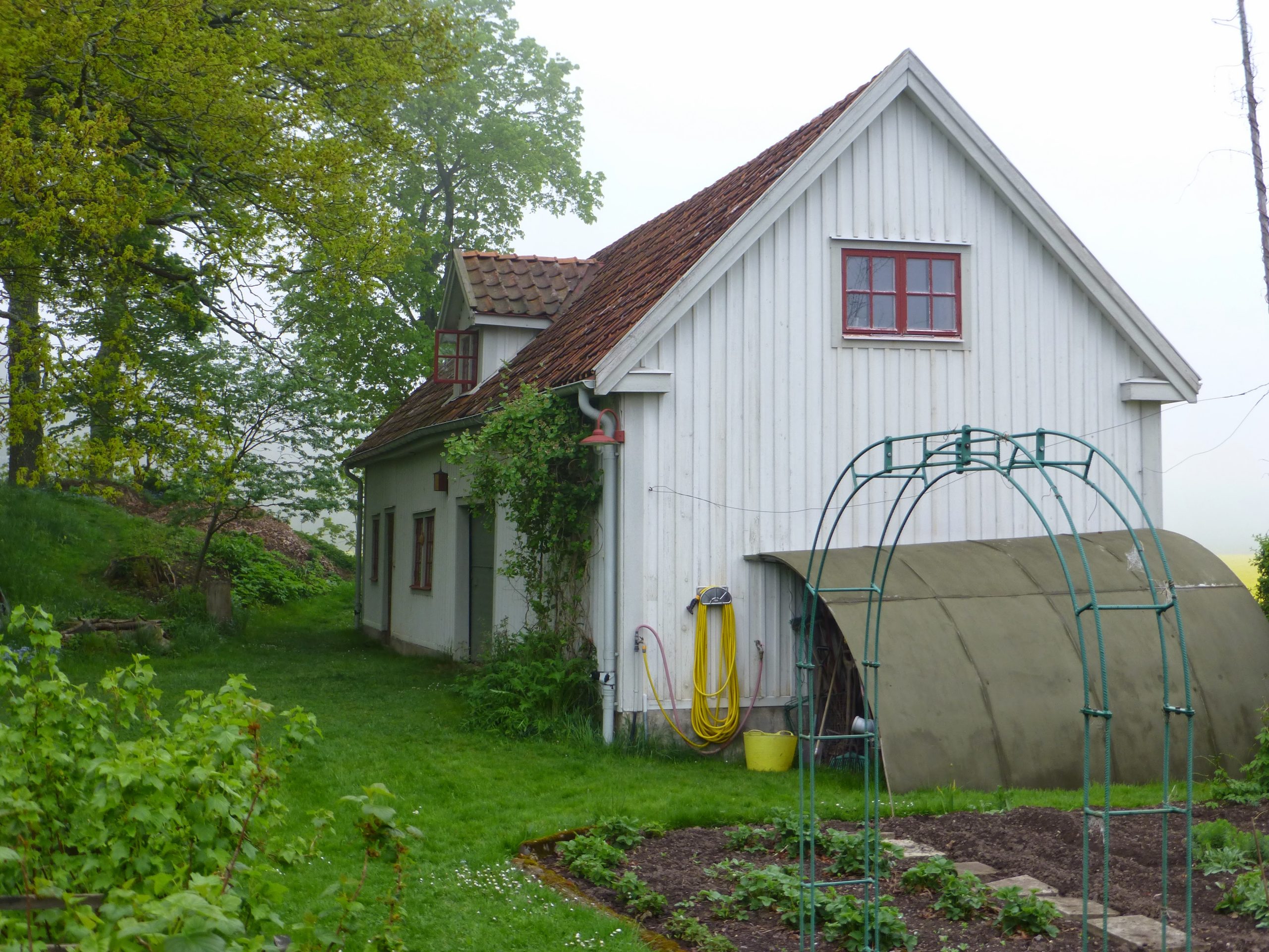 På tomten finns ytterligare två byggnader. Ett vackert, stort hus i två våningar och ett mindre hus med kallförråd för de tre lägenheterna.
